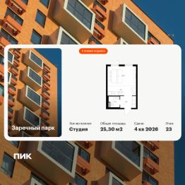 Продаётся квартира-студия площадью 25,3 кв.м на 23 этаже 24 этажного дома (Корпус 6, Секция 2) проекта ПИК Заречный парк. Светлый просторный подъезд на уровне земли, функциональная планировка, большие окна, c отделкой.