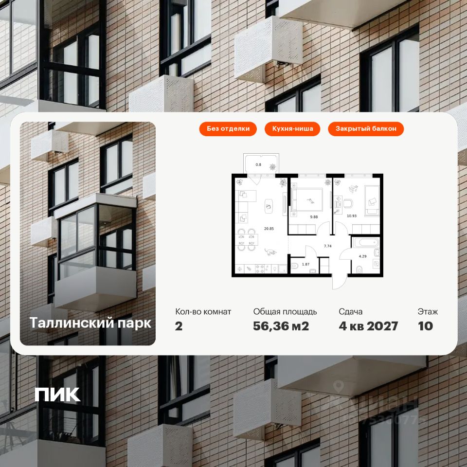 Продаётся 2-комн. квартира площадью 56,36 кв.м на 10 этаже 12 этажного дома (Корпус 4.2, Секция 1) проекта ПИК Таллинский парк. Светлый просторный подъезд на уровне земли, функциональная планировка, большие окна, без отделки.