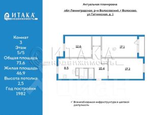 общая площадь 73,6 м2, комнаты раздельные 17.2+17.1+12.6, кухня 8,5м2, на 5/5 этаже панельного дома 1982 года постройки, 121 Гатчинской серии