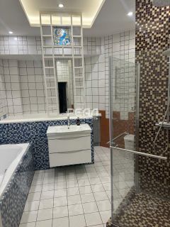 Кухня - столовая с островом и современным оборудованием. Два санузла, гостевой и основной. В основном - ванна, душевая кабина, умывальник и унитаз.