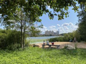 До метро 10 -15 мин транспортом, 20 мин на машине до центра Санкт-Петербурга. В окружении парков, заповедников и озер. Настоящий оазис в черте города!