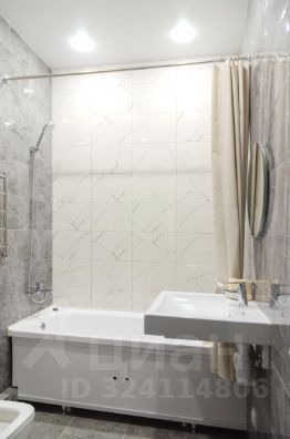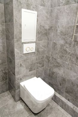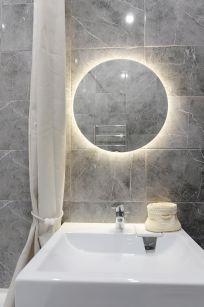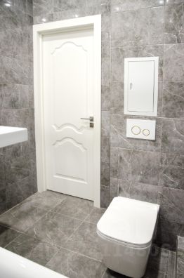 Ванная комната - все трубы убраны в короб, оставлен доступ для ревизии, отделка керамогранитом, полноценная ванная и место для стиральной машины;