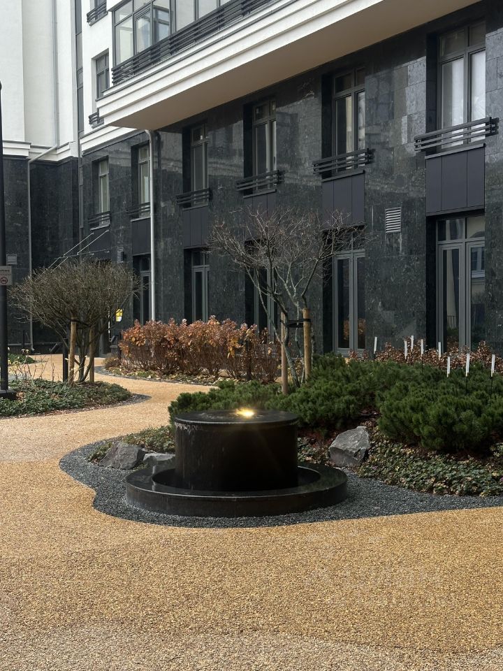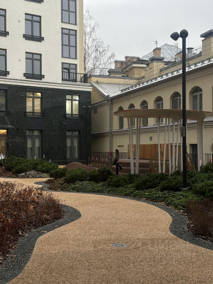 Внутренняя закрытая территория дома произведение искусства. Ландшафтный дизайн двора выполнен компанией DerevoPark. Подземный паркинг с возможностью зарядки электромобилей. Въезд в подземный паркинг осуществляется по номерному знаку автомобиля. Территория комплекса закрытая, проход по специальным бесконтактным меткам, круглосуточная охрана и система контроля доступа. Предусмотрена гостевая парковка на территории комплекса.