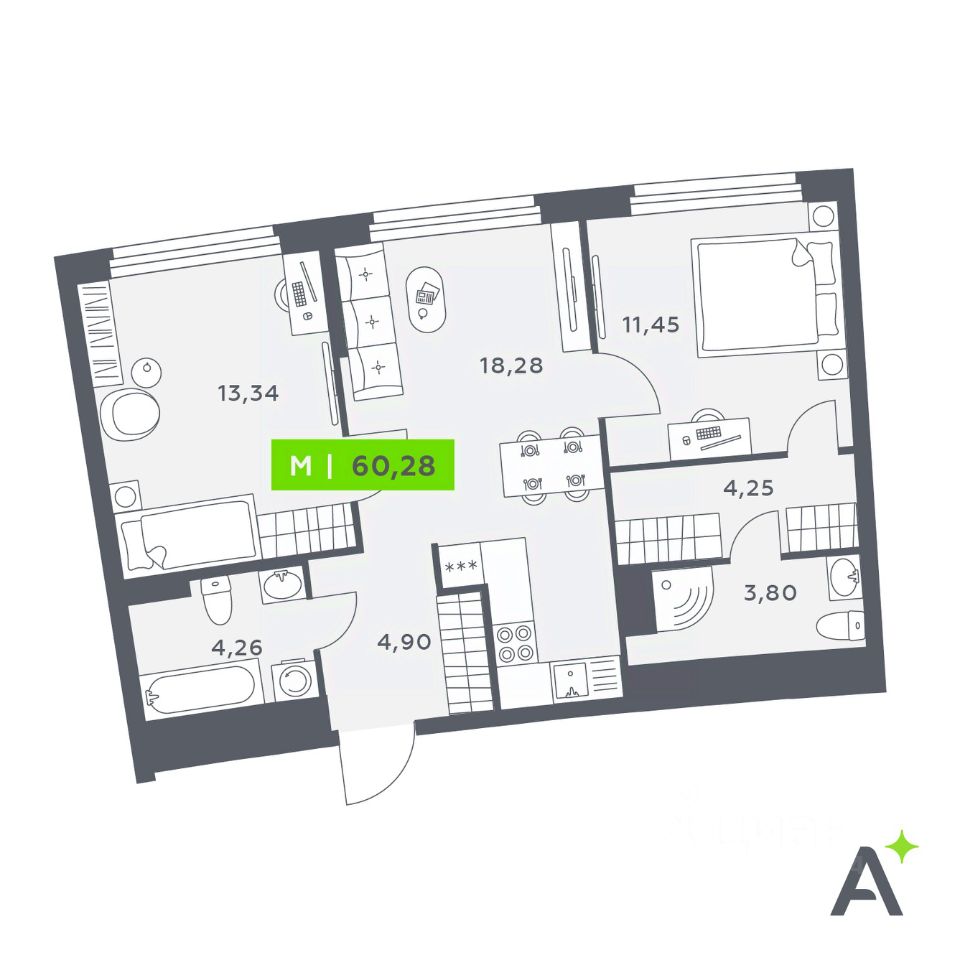 Продаётся 3-комнатная квартира в строящемся доме (Корпус 1), срок сдачи: IV-кв. 2027, общей площадью 60.28 кв.м., на 11 этаже. Новый жилой комплекс "Аквилон RIVA" от застройщика "Группа Аквилон" расположен по адресу:Ленинградская область, Всеволожский район, Мурино