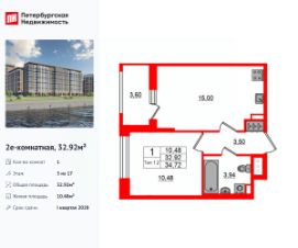 Удобная, классическая, функциональная европланировка, большая кухня-гостиная 15 м², вместительная прихожая 3.5 м². Общая площадь квартиры - 32.92 м², жилая 10.48 м², высота потолка 2.77 м.