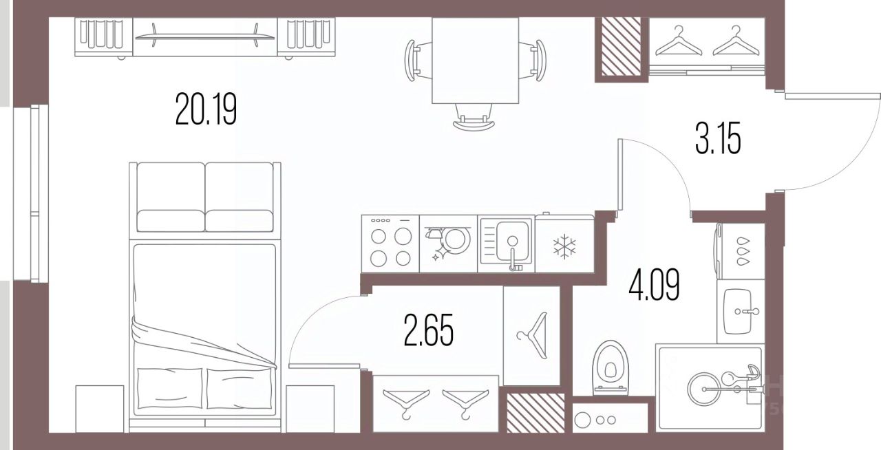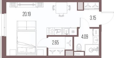 1-комн. квартира-студия с предчистовой отделкой в ЖК "LEGENDA Васильевского" на 2 этаже. Общая площадь: 30.08 кв.м., площадь гостиной 20.19 кв.м., из которых 5 кв.м. выделено под кухонную зону. Все окна выходят на одну сторону. В квартире один совмещенный санузел. Высота потолков 2.72 м.
