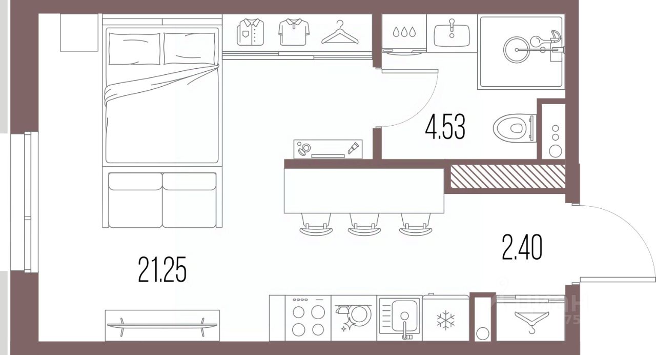 Однокомнатная квартира-студия в ЖК "LEGENDA Васильевского" на 10 этаже. Общая площадь: 28.18 кв.м. Высота потолков 2.72 м.