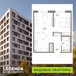 Продается однокомнатная квартира с предчистовой отделкой в ЖК "LEGENDA Васильевского" на 2 этаже. Общая площадь: 44.42 кв.м., жилая: 12.21 кв.м., площадь просторной кухни-столовой: 23.33 кв.м. Все окна выходят на одну сторону. В квартире один совмещенный санузел. Высота потолков 2.72 м.