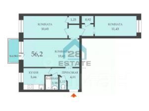 Квартира общей площадью 56.2кв. м, расположена на 3 этаже в окружении деревьев.