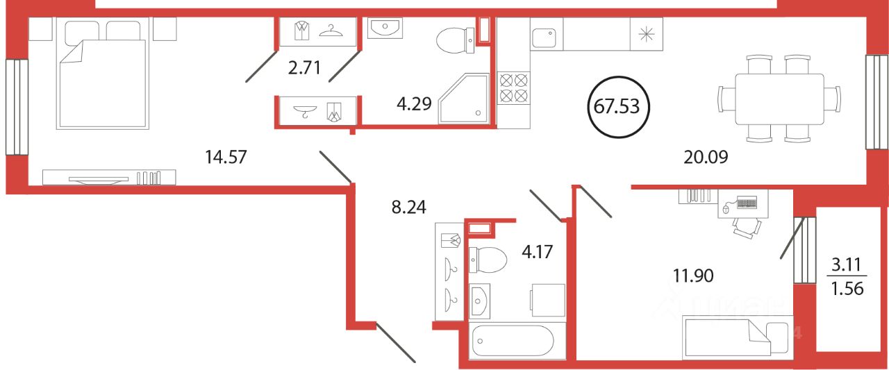 Продаётся e3 комнатная квартира (евро) в жилищном комплексе "Энфилд" (корпус Дом 18 секция 1). Общая площадь 67,53 кв. м, площадь комнат 11,9 кв.м, 14,57 кв.м. 2 санузла. Квартира расположена на 2 этаже 12 этажного дома. Срок сдачи корпуса IV квартал 2027 года.