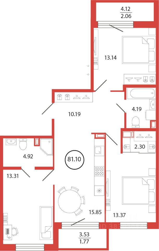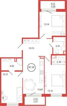Продаётся e4 комнатная квартира (евро) в жилищном комплексе "Энфилд" (корпус Дом 18 секция 2). Общая площадь 81,1 кв. м, площадь комнат 13,14 кв.м, 13,37 кв.м, 13,31 кв.м. 2 санузла. Квартира расположена на 5 этаже 12 этажного дома. Срок сдачи корпуса IV квартал 2027 года.