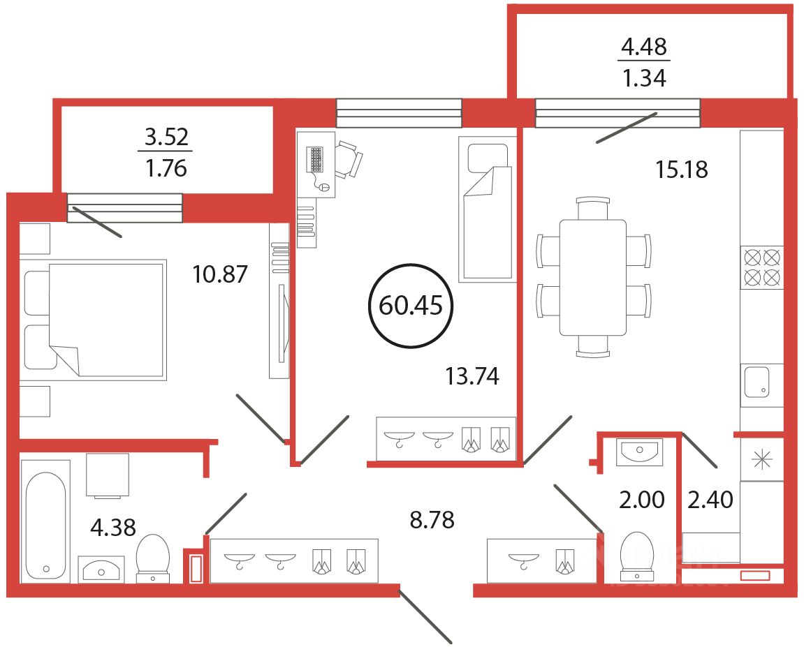 Продаётся e3 комнатная квартира (евро) в жилищном комплексе "Энфилд" (корпус Дом 18 секция 2). Общая площадь 60,45 кв. м, площадь комнат 10,87 кв.м, 13,74 кв.м. 2 санузла. Квартира расположена на 9 этаже 12 этажного дома. Срок сдачи корпуса IV квартал 2027 года.
