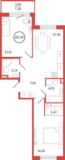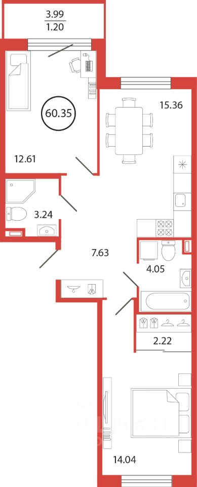 Продаётся e3 комнатная квартира (евро) в жилищном комплексе "Энфилд" (корпус Дом 18 секция 3). Общая площадь 60,35 кв. м, площадь комнат 12,61 кв.м, 14,04 кв.м. 2 санузла. Квартира расположена на 2 этаже 12 этажного дома. Срок сдачи корпуса IV квартал 2027 года.