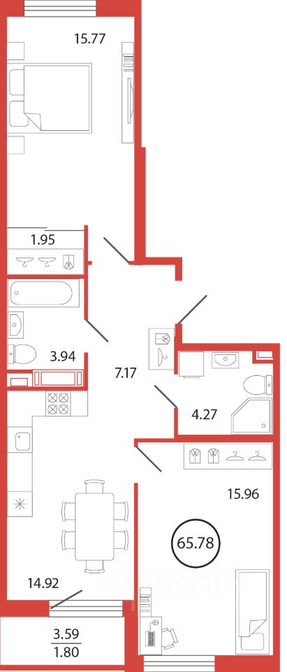 Продаётся e3 комнатная квартира (евро) в жилищном комплексе "Энфилд" (корпус Дом 18 секция 5). Общая площадь 65,78 кв. м, площадь комнат 15,96 кв.м, 15,77 кв.м. 2 санузла. Квартира расположена на 7 этаже 12 этажного дома. Срок сдачи корпуса IV квартал 2027 года.