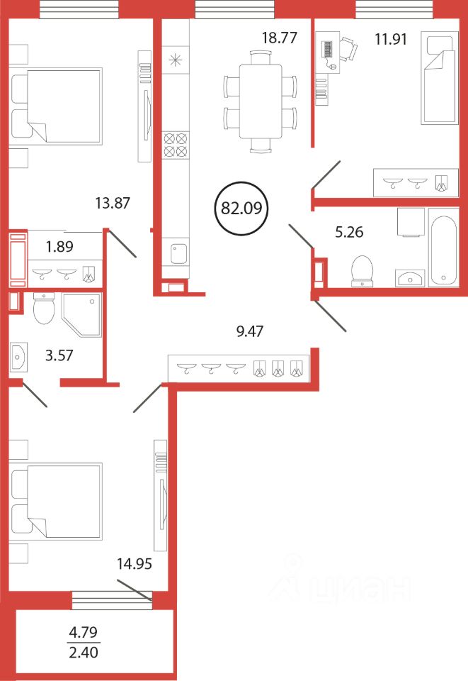 Продаётся e4 комнатная квартира (евро) в жилищном комплексе "Энфилд" (корпус Дом 18 секция 6). Общая площадь 82,09 кв. м, площадь комнат 14,95 кв.м, 13,87 кв.м, 11,91 кв.м. 2 санузла. Квартира расположена на 5 этаже 12 этажного дома. Срок сдачи корпуса IV квартал 2027 года.