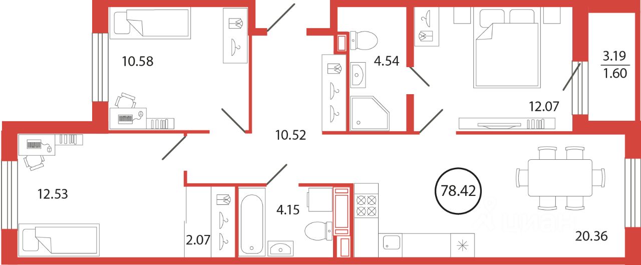 Продаётся e4 комнатная квартира (евро) в жилищном комплексе "Энфилд" (корпус Дом 18 секция 6). Общая площадь 78,42 кв. м, площадь комнат 12,53 кв.м, 10,58 кв.м, 12,07 кв.м. 2 санузла. Квартира расположена на 9 этаже 12 этажного дома. Срок сдачи корпуса IV квартал 2027 года.