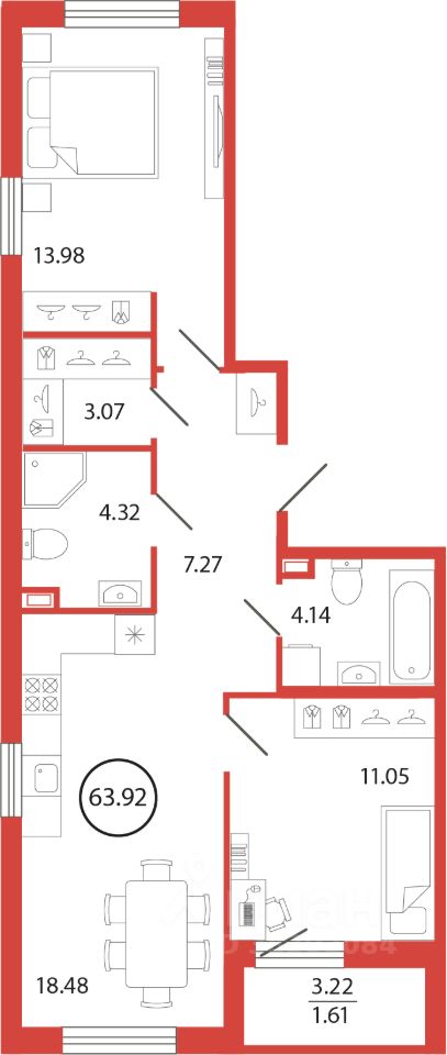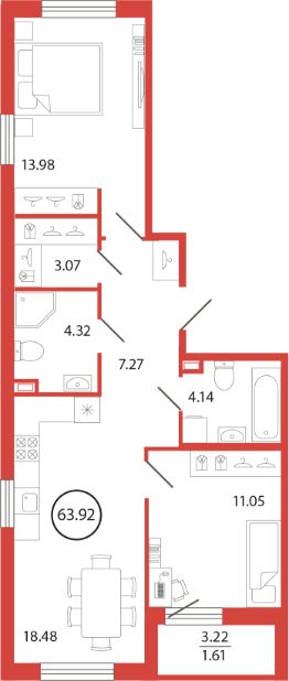 Продаётся e3 комнатная квартира (евро) в жилищном комплексе "Энфилд" (корпус Дом 18 секция 8). Общая площадь 63,92 кв. м, площадь комнат 11,05 кв.м, 13,98 кв.м. 2 санузла. Квартира расположена на 2 этаже 12 этажного дома. Срок сдачи корпуса IV квартал 2027 года.