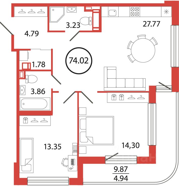 Продаётся e3 комнатная квартира (евро) в жилищном комплексе "Энфилд" (корпус Дом 21 Секция 1). Общая площадь 74,02 кв. м, площадь комнат 13,35 кв.м, 14,3 кв.м. 2 санузла. Квартира расположена на 9 этаже 12 этажного дома. Срок сдачи корпуса IV квартал 2027 года.