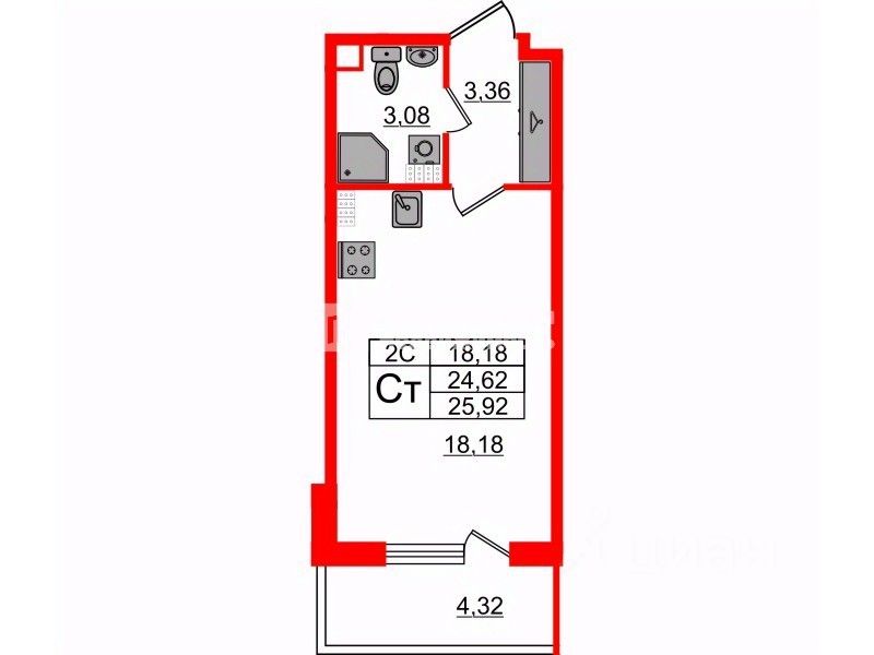 Отличная планировка: общая площадь студии (с учетом площади балкона) - 28,94 м2, комната 18.18 м2, застекленный балкон площадью 4,32м2, вместительная прихожая 3.36 м2, санузел 3,08 м2, высота потолка 3.07 м.