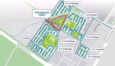Корпус 6.1 расположен в 6-й очереди внутри ЖК "Парадный Ансамбль".