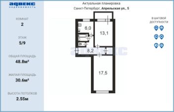 Общая площадь квартиры 48,8 кв.м., жилая (17,5+13,1)кв.м, комнаты изолированы, кухня 6 кв.м, санузел раздельный, прихожая 8,2 кв.м., имеется балкон. Окна выходят на две стороны: на Апрельскую улицу и в благоустроенный двор. В летний и осенний период вид завораживает.
