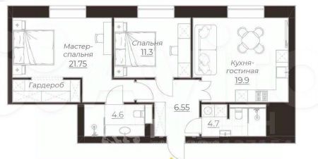 Общая площадь 68,6 кв. м., кухня-гостиная 20 кв. м., 2 большие светлые спальни (21,75; 11,3) кв.м., одна из которых со своей ванной комнатой и гардеробной, Квартира двухсторонняя. 2 санузла. Высота потолков 3,6 м.
