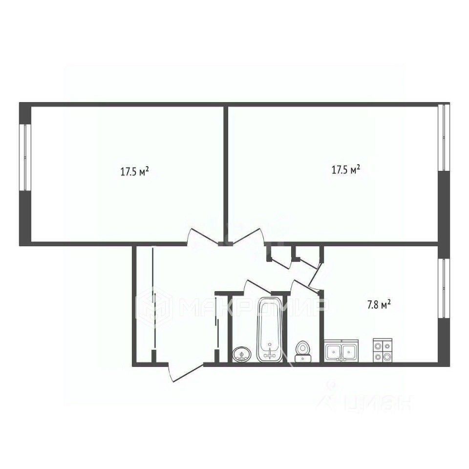-Удобная планировка на две стороны (распашонка). С кухней 7,8 кв.м. и изолированными комнатами 17,5+17,5 кв.м. соответственно. Окна выходят в тихий, зелёный двор и небольшой сквер со стороны ул.Стасовой.