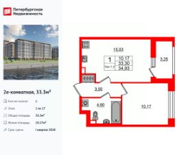 Удобная, классическая, функциональная европланировка, большая кухня-гостиная 15.03 м², вместительная прихожая 3.5 м². Общая площадь квартиры - 33.3 м², жилая 10.17 м², высота потолка 3 м.