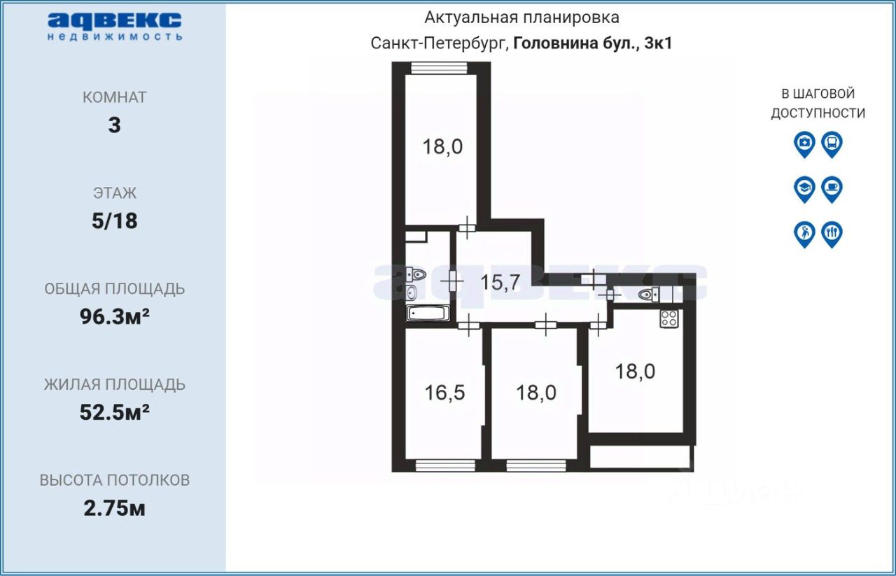 - Двусторонняя планировка, застеклённый балкон, из окна одной из комнат открывается панорамный вид на акваторию Финского залива и Вантовый мост