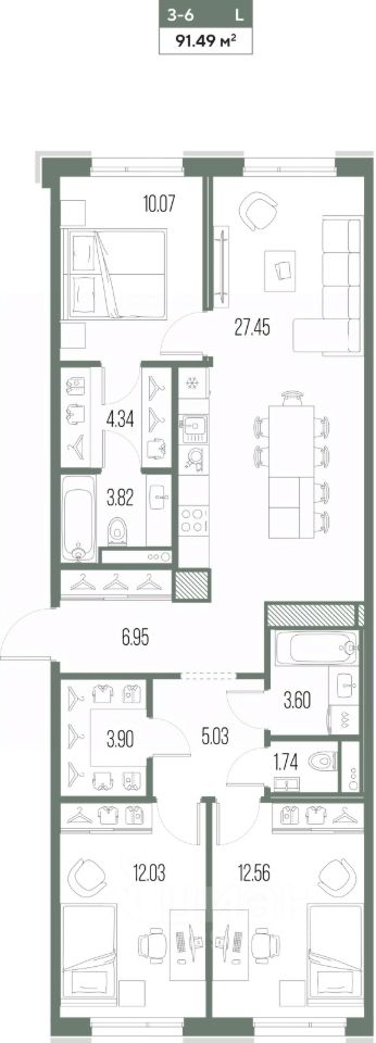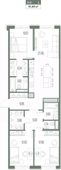 Просторная 3-комн. квартира в ЖК "LEGENDA Васильевского" на 2 этаже. Общая площадь: 91.49 кв.м. Высота потолков 2.72 м.
