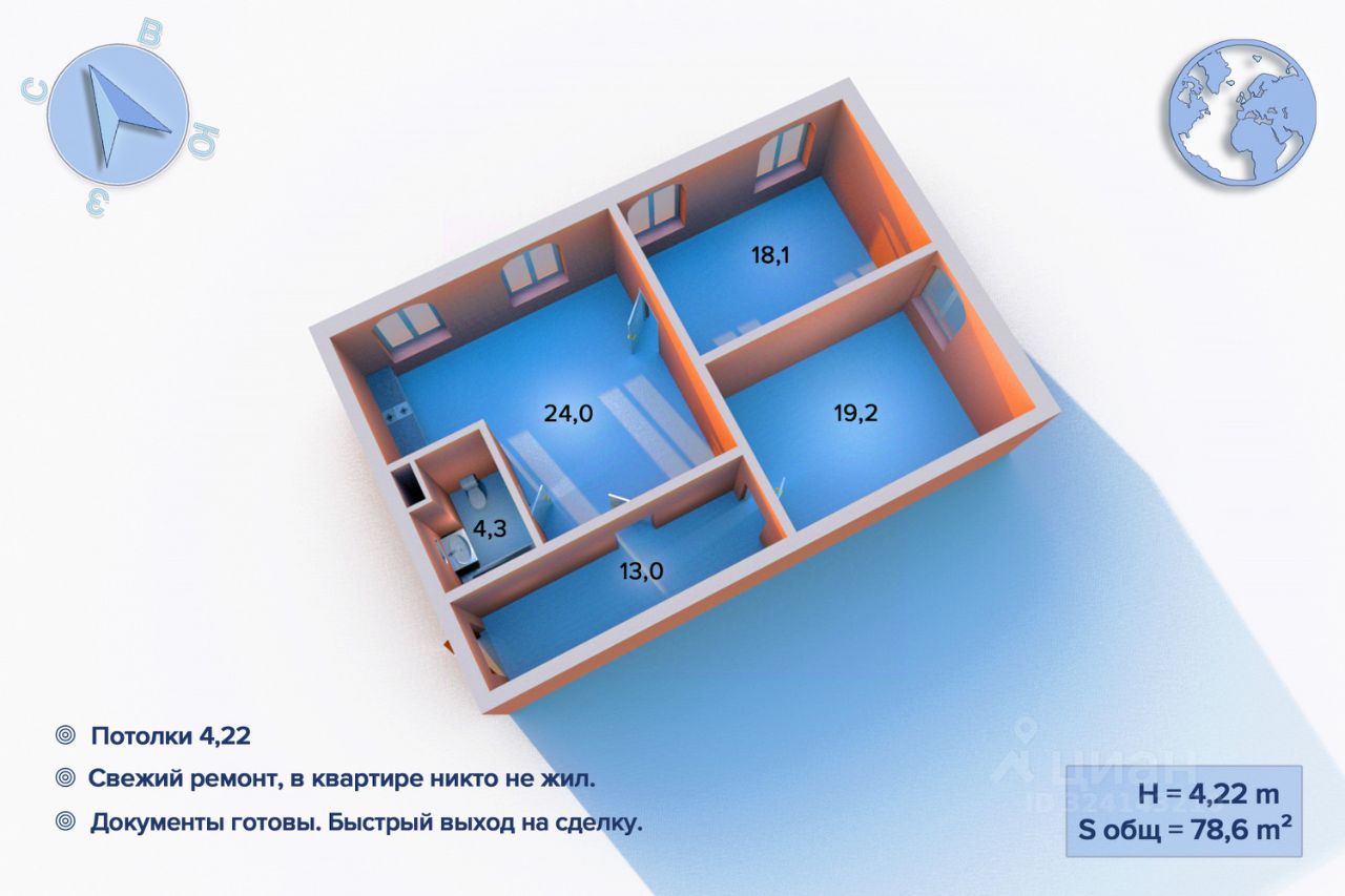 Площадь — 78,6 м². Высокие потолки (4,22 м) позволяют создать второй ярус — для спального места или хранения.