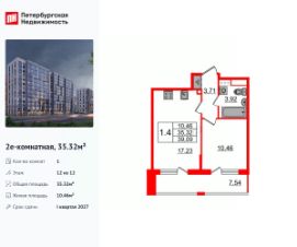 Удобная, классическая, функциональная европланировка, большая кухня-гостиная 17.23 м², вместительная прихожая 3.71 м². Общая площадь квартиры - 35.32 м², жилая 10.46 м², высота потолка 3 м.