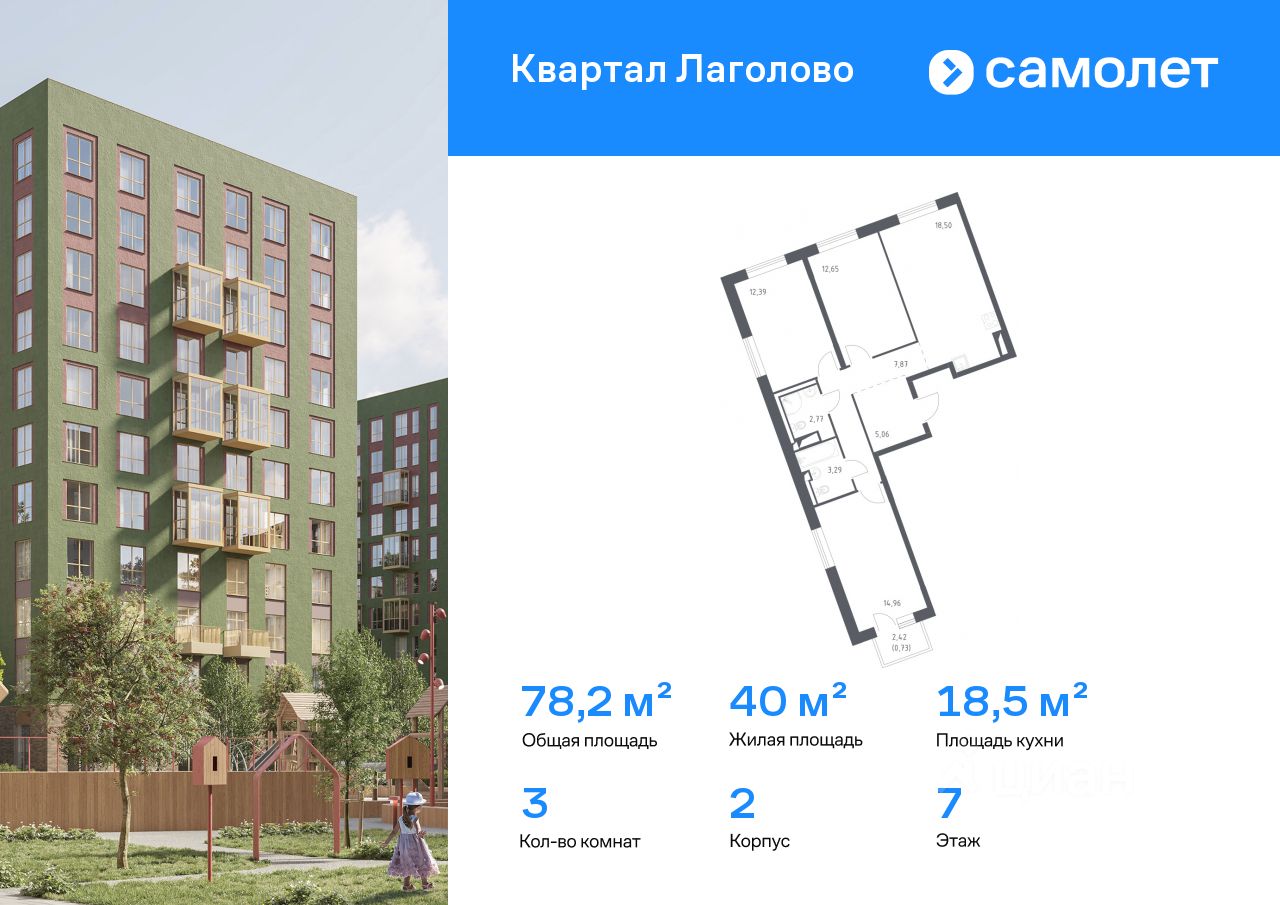 Строим кварталы для жизни с заботой о будущем. Предлагается 3-комнатная квартира комфорт-класса 78,22 кв.м в корпусе 2 на 7 этаже, в ЖК "Квартал Лаголово"