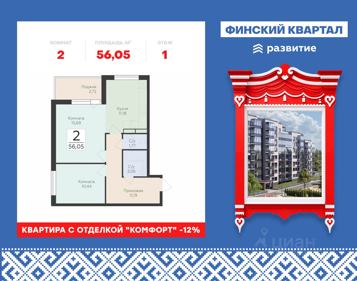 "Продается квартира площадью 56.05 кв. м без отделки. Квартира расположена на 1 этаже 7 этажного дома, в жилом комплексе комфорт-класса "Финский Квартал".