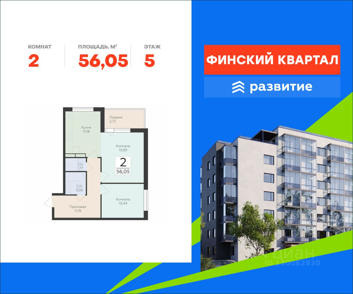 Продается квартира площадью 56.05 кв. м с отделкой white box. Квартира расположена на 5 этаже 8 этажного дома, в жилом комплексе комфорт-класса "Финский Квартал".