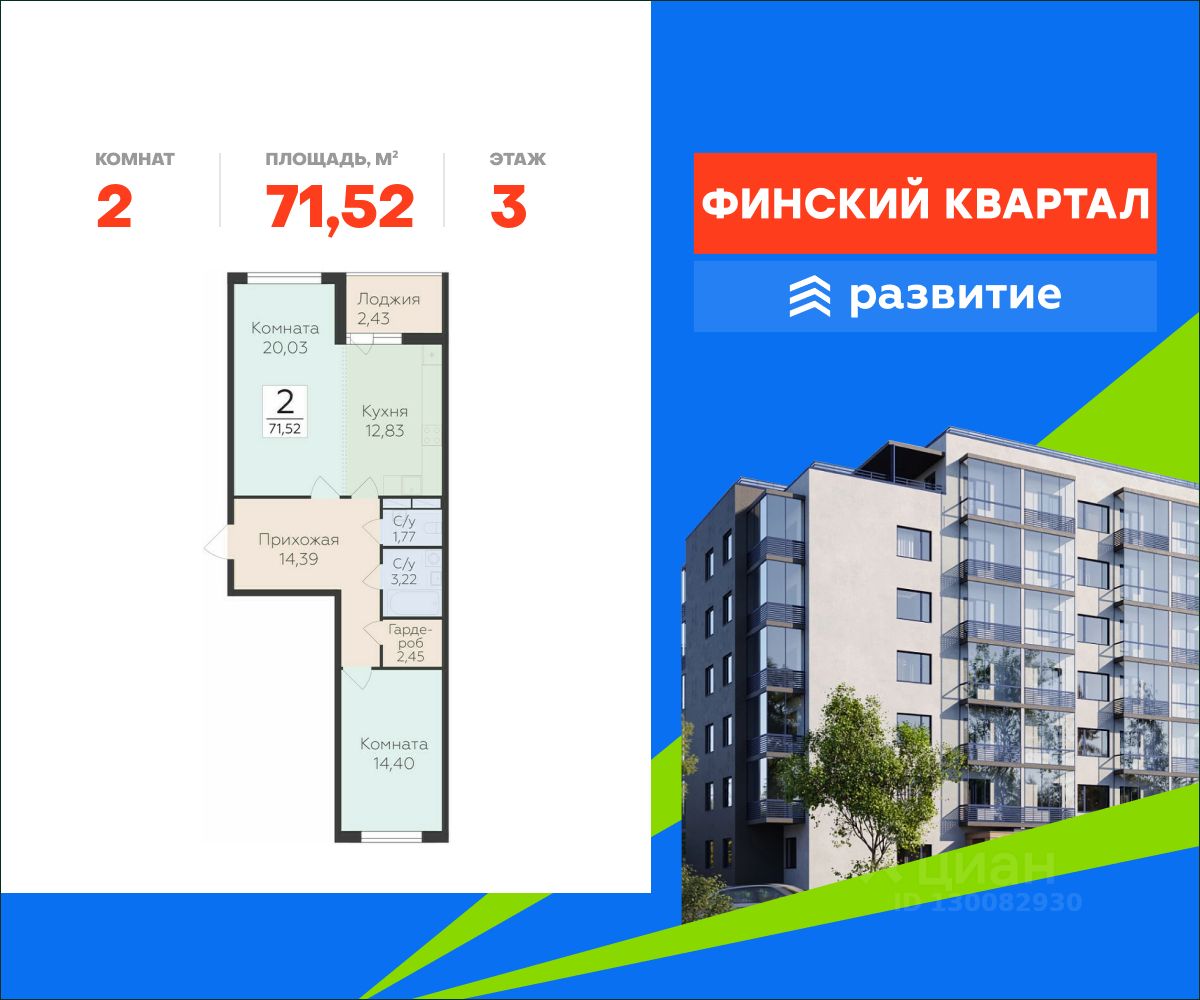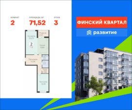 Продается квартира площадью 71.52 кв. м с отделкой white box. Квартира расположена на 3 этаже 7 этажного дома, в жилом комплексе комфорт-класса "Финский Квартал".