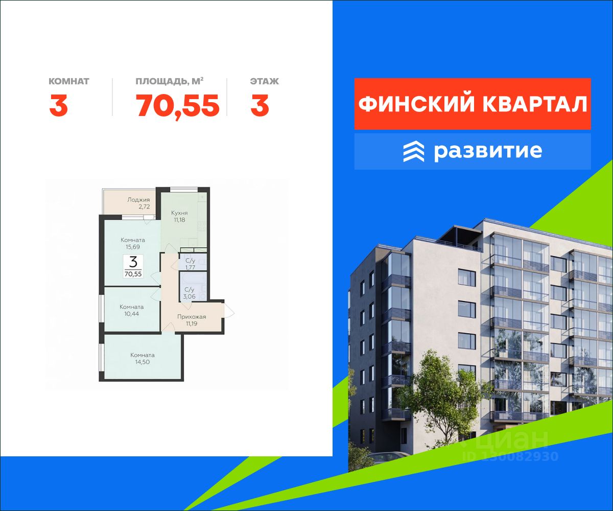 Продается квартира площадью 70.55 кв. м с отделкой white box. Квартира расположена на 3 этаже 7 этажного дома, в жилом комплексе комфорт-класса "Финский Квартал".