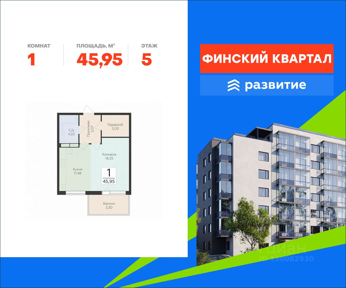 Продается квартира площадью 45.95 кв. м с отделкой white box. Квартира расположена на 5 этаже 7 этажного дома, в жилом комплексе комфорт-класса "Финский Квартал".