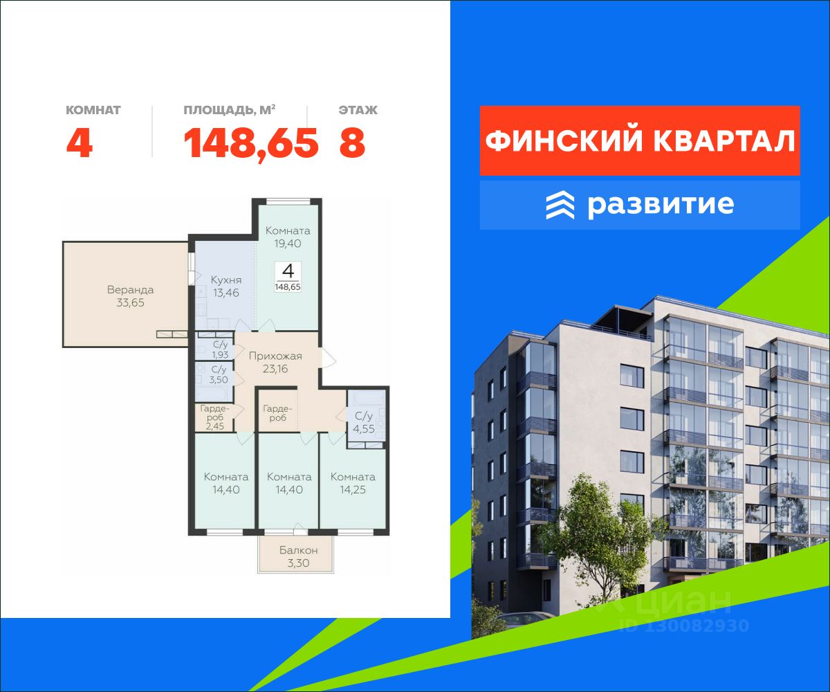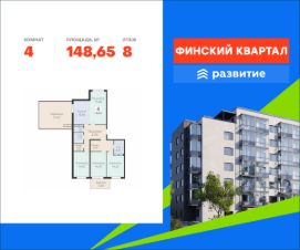Продается квартира площадью 148.65 кв. м с отделкой white box. Квартира расположена на 8 этаже 8 этажного дома, в жилом комплексе комфорт-класса "Финский Квартал".