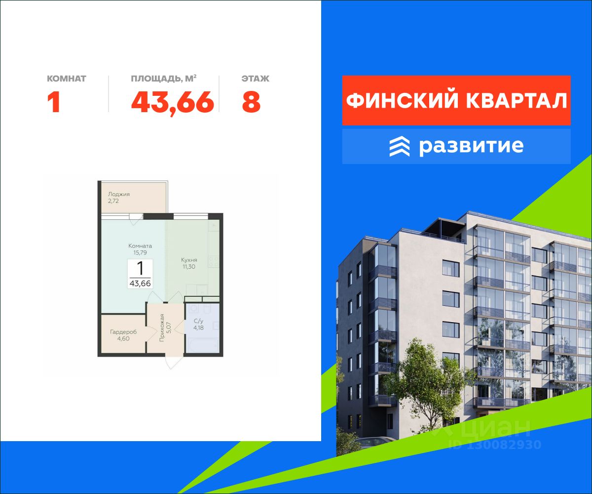 Продается квартира площадью 43.66 кв. м с отделкой white box. Квартира расположена на 8 этаже 8 этажного дома, в жилом комплексе комфорт-класса "Финский Квартал".