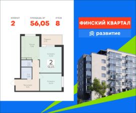 Продается квартира площадью 56.05 кв. м с отделкой white box. Квартира расположена на 8 этаже 8 этажного дома, в жилом комплексе комфорт-класса "Финский Квартал".