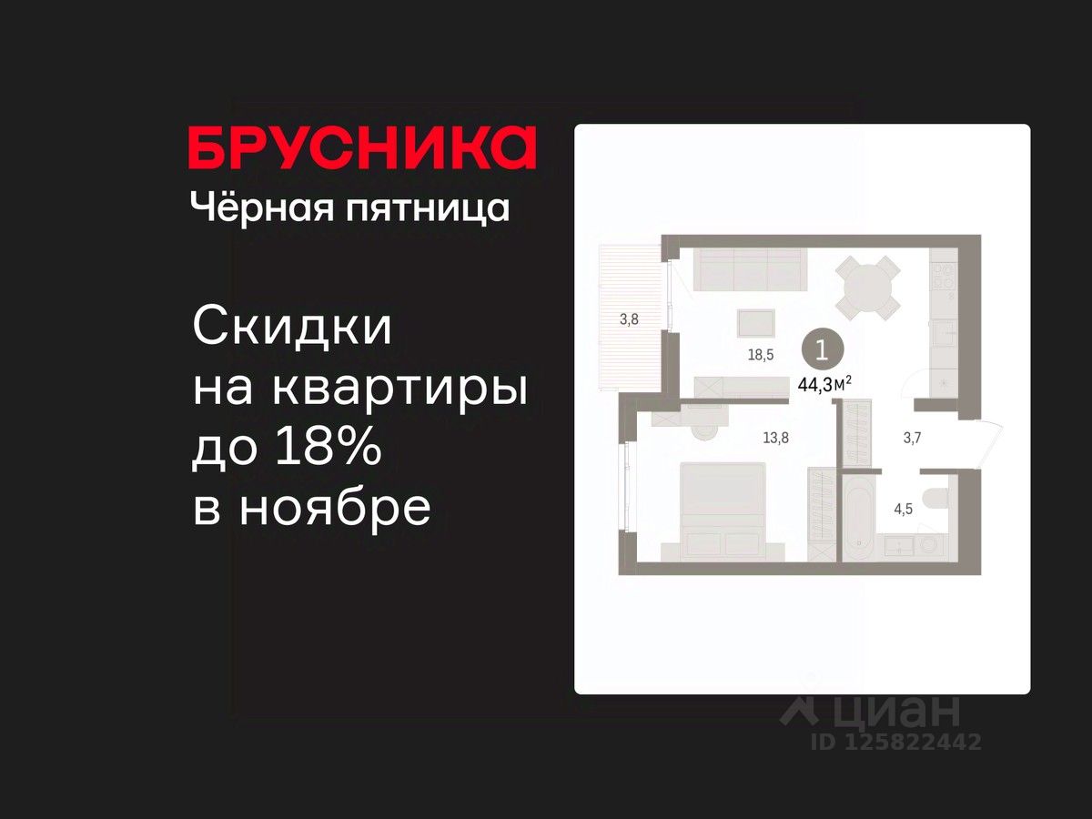 1-комн. квартира с предчистовой отделкой в ЖК "Брусника в Новоселье" на 6 этаже. Общая площадь: 44.26 кв.м., жилая: 13.8 кв.м., площадь просторной кухни-столовой: 18.5 кв.м. Все окна выходят на одну сторону. В квартире одна лоджия, один совмещенный санузел. Высота потолков 2.7 м.