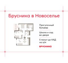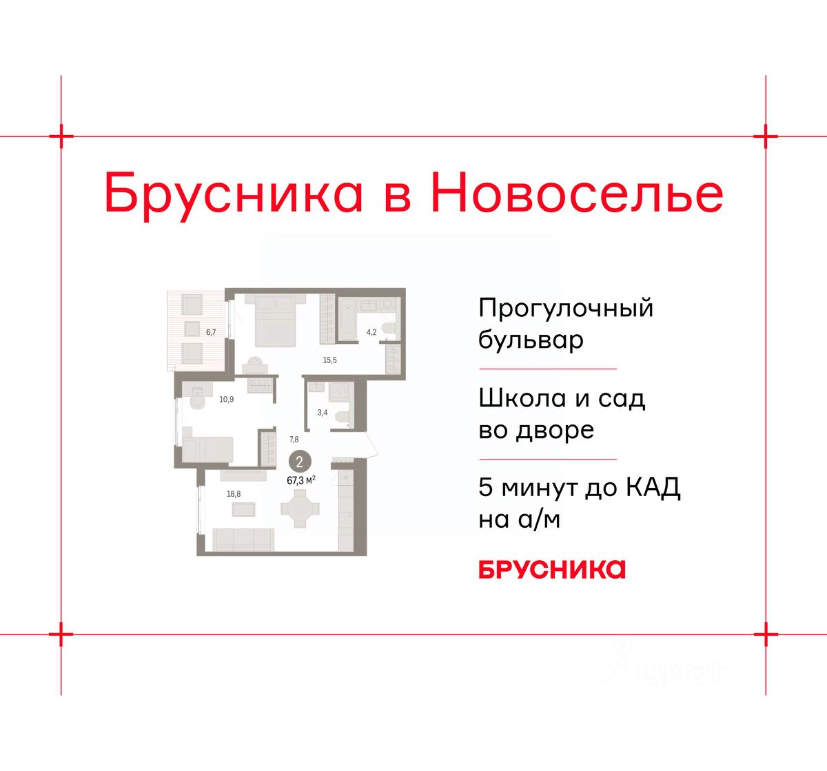2-комн. квартира от застройщика с предчистовой отделкой в ЖК "Брусника в Новоселье" на 9 этаже. Общая площадь: 67.31 кв.м., жилая: 26.4 кв.м., площадь просторной кухни-столовой: 18.8 кв.м. Комнаты изолированные, все окна выходят на одну сторону. В квартире одна лоджия, два совмещенных санузла. Высота потолков 2.7 м.