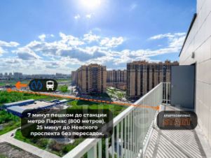 До станции метро Парнас 800 метров (7 минут пешком). Прямая ветка до центра города, до Невского проспекта 25 минут.
