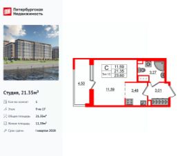 Удобная, классическая, функциональная европланировка, вместительная прихожая 3.01 м². Общая площадь студии - 21.35 м², жилая 11.59 м², высота потолка 2.77 м.