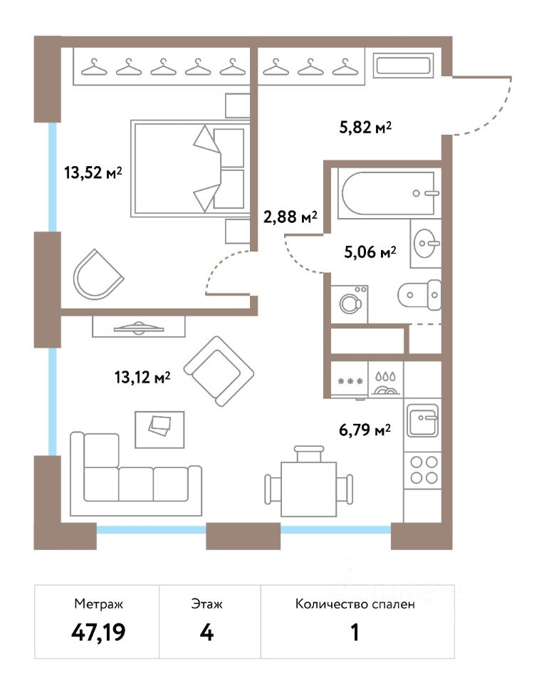 Однокомнатная квартира (евро- двушка) 46.7 кв.м. в жилом комплексе бизнес-класса "Малоохтинский, 68" от застройщика LEGENDA-комфорт, стиль, качество и удобная локация, продуманная SMART-планировка — эргономично и функционально.