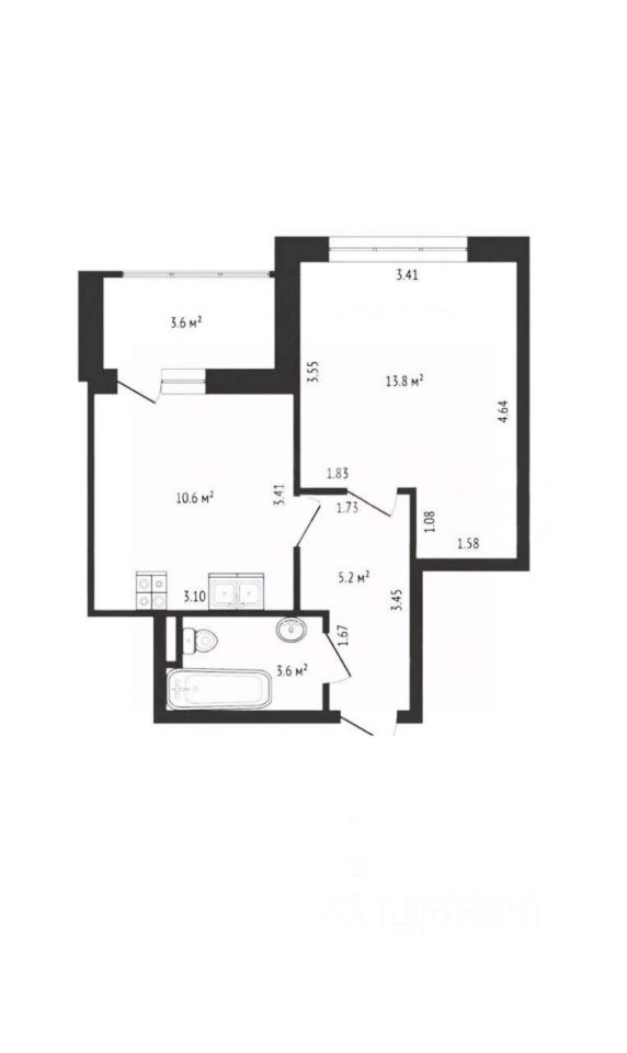 Эргономичная планировка: кухня 10.6 м², жилая комната 13.8 м². Высота потолков 2.75 м.