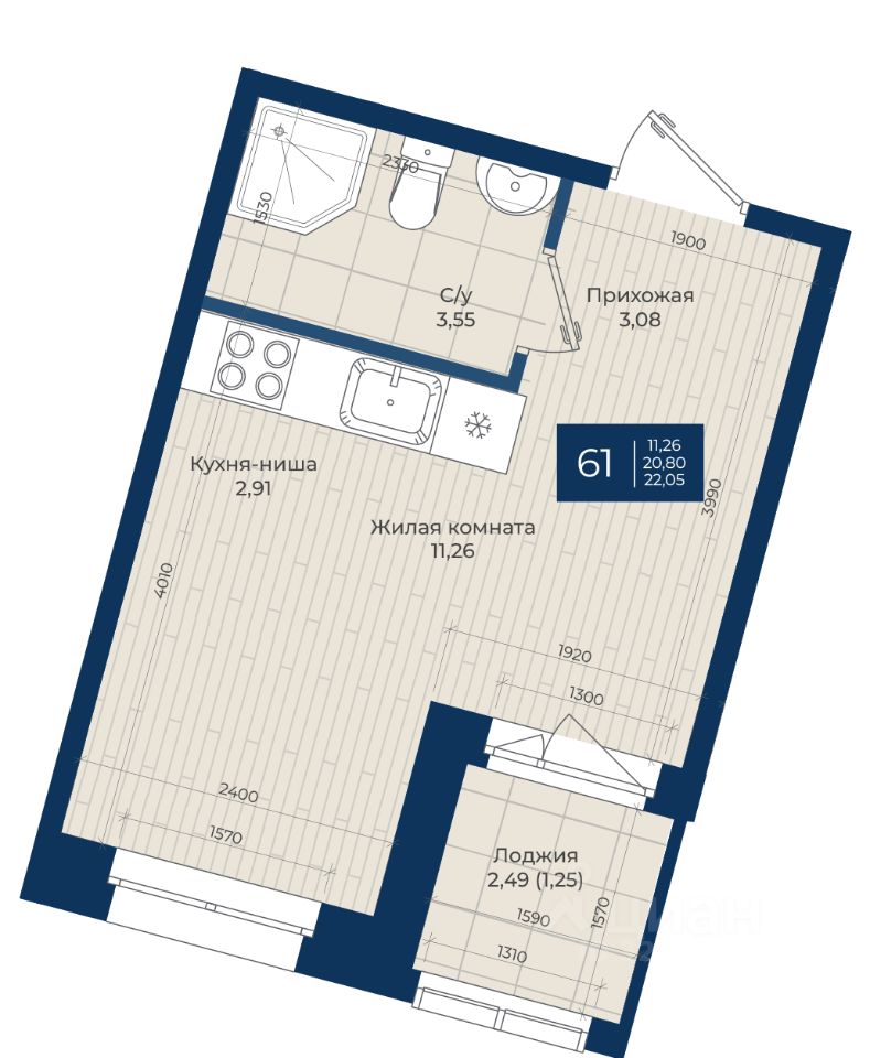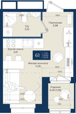 Жилой комплекс "Новатория", 1 очередь строительства, Корпус Б, Квартира 61 общей площадью 22,05 м2 на 1 этаже.ЖК "Новатория" —жилой комплекс комфорт-класса расположен в поселке Новоселье, в окружении леса и Шунгеровского заказника.