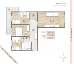 жилая: 39.1 кв.м., кухня: 7.9 кв.м., комнаты: 17.6 кв.м., 10.2 кв. м., 11.3 кв.м.