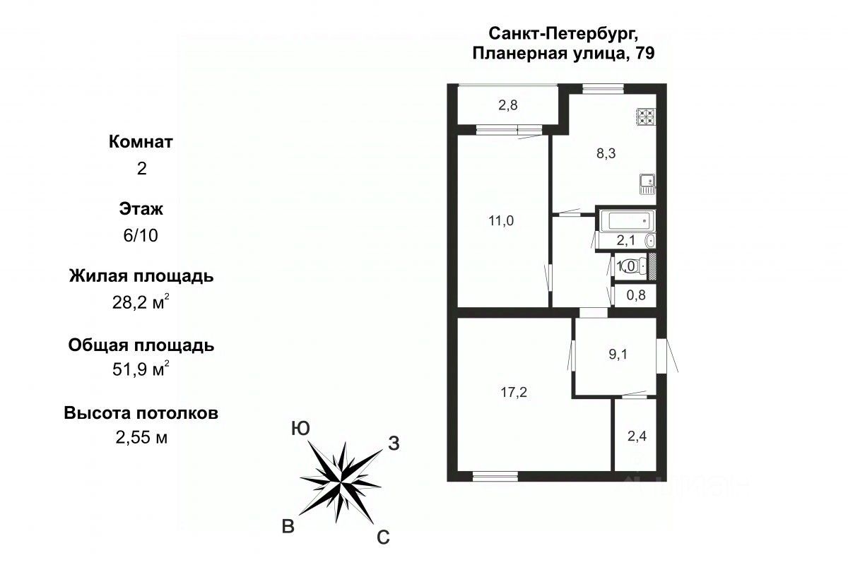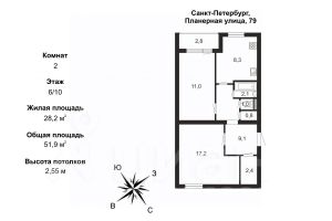 2к.кв Площадью 51,9 кв.м., просторные комнаты 17,2 кв.м. и 11,0 кв.м. с выходом на застекленную лоджию 2,8 кв.м., кухня 8,3 кв.м. с кухонным гарнитуром., сан.узел раздельный. Две большие кладовые.